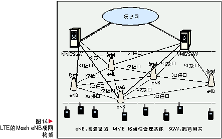 3GPP组织从推动3G WCDMA的标准化研究和应用开始,使以WCDMA/TD-SCDMA为基础的第3代移动通信系统不断完善和增强。3GPP在现有3G移动通信系统(UMTS)R99之后,相继推出高速数据分组接入(HSDPA)的R5、高速上行分组接入(HSUPA)的R6的标准版本。进入21世纪以来,以IEEE 802系列为代表的宽带无线接入技术和标准建议受到了广泛关注,特别是它们更高的数据速率,对移动性的支持,逐渐形成了对现有移动通信系统的竞争态势。因此,为对抗这种技术竞争和市场竞争,3GPP在2004年启动了3G长期演进(LTE)项目。LTE系统使用20 MHz带宽,空中接口峰值速率下行100 Mb/s(频谱效率5 bps/Hz)、上行50 Mb/s(频谱效率2.5 bps/Hz)。采用IP网络作为承载网,为达到简化信令流程,缩短延迟的目的,LTE舍弃了UTRAN的RNC+NodeB的基站系统结构,完全仅由增强基站(eNB)组成。LTE系统的拓扑结构如图14所示,基站之间底层采用IP传输,在逻辑上通过X2接口互相连接,是传统的Mesh型网络。这样的网络结构设计,主要用于支持用户终端在整个网络内的移动性,保证用户的无缝切换。而每个基站通过S1接口和服务网关(SGW)相连。而S1接口也采用Mesh或部分Mesh型的连接形式,实现一个基站可以和多个SGW相连,为运营商和用户不断增长的需求提供更好的支持,希望做到今后10年甚至更长时间,一直保持UMTS系统优势。