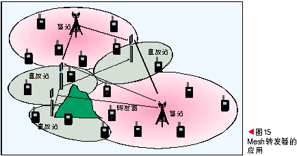 移动通信中经常面临小区边缘间覆盖的空洞(信号弱不能稳定接收地点)和部分远端地区的接入要求,就利用直放站作简单的基站延伸,达到需要的覆盖要求。由于直放站过于简单,信号质量差,接入能力低,对周围干扰大,没有升级适应能力。近年,用引入Mesh技术的Mesh转发器代替直放站,是达到上述目的的有效手段,如图15所示。图中,基站能提供的覆盖有限,邻近小区间、高大障碍物后,都有信号微弱地区,引入Mesh转发器做中继后,能很好覆盖,并可在移动用户变动情况下,自适应调度Mesh转发器的工作状态,可根据需要最大负载运行或暂停工作,实现网络能力合理、有效。这样,采用Mesh转发器后,网络有扩展和重组能力,还可不断升级,对覆盖区域的任何用户提供高质量和高速率的宽带服务。