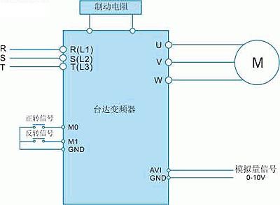 变频器AVI/GND端子提供与数控系统速度模拟量,AVI接数控系统模拟量接口正信号,GND接负信号,信号为0-10V模拟电压信号,控制主轴转速。M0/M1/GND为变频器的正转/反转信号端子,通常由数控系统发出正转信号FWD或者反转REV,来驱动中间继电器,中间继电器的常开接点接入变频器M0/GND或者M1/GND,从而控制变频器的正反转。