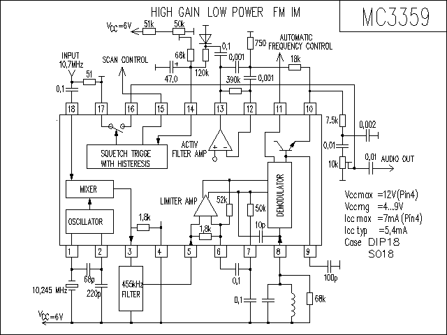 MC3359是美国MOTOROLA公司生产的单片窄带调频接收电路,主要应用于语音通讯的无线接收机。片内包含振荡电路、混频电路、限幅放大器、AFC(自动频率控制)、积分鉴频器、滤波器、抑制器、扫描控制器及静噪开关电路。MC3359类似于MC3357,并在其基础上增加了中放限幅放大级、AFC输出级和调频检波器,主要应用于采用455kHz陶瓷滤波器的二次变频的通讯接收设备。MC3359同样仅需要较少的外接元件。要求其工作电压在6.0V以下,适合于经济的应用场合,推荐使用MC3361BP、BD。若使用陶瓷滤波器固定的频点,类似的二次变频接收电路可参考MC3335、MC3362、MC3363。MC3359主要特性如下: · 低功耗(在Vcc=6.0V,耗电典型值仅为3.6mA)· 极限灵敏度:2.0uV(-3bB)(典型值) · 少量的外接元件 · DIP18和SO-18两种封装形式 · 如需要低电压及RSSI,推荐使用性能更优越的MC3371接收电路 ![]() ![]() MC3359的内部振荡电路与Pin1和Pin2的外接元件组成第二本振级,第一中频IF输入信号10.7MHz从MC3359的Pin18输入,在内部第二混频级进行混频,其差频为:10.700-10.245=0.455MHz,也即455kHz第二中频信号。 第二中频信号由Pin3输出,由455kHz陶瓷滤波器选频,再经Pin5送入MC3359的限幅放大器进行高增益放大,限幅放大级是整个电路的主要增益级。Pin8的外接元件组成455kHz鉴频谐振回路,经放大后的第二中频信号在内部进行鉴频解调,并经一级音频电压放大后由Pin10输出音频信号。 Pin14——Pin17为载频检测和电子开关电路,通过外接少量的元件即可构成载频检测电路,用于调频接收机的静噪控制。MC3359内部还置有一级滤波信号放大级,加上少量的外接元件可组成有源选频电路,为载频检测电路提供信号,该滤波器Pin12为输入端,Pin13为输出端。Pin6、Pin7和Pin9为第二中放级的退耦电容。 MC3359的极限参数(Ta=25℃)名称引脚位置标识符极限值单位电源电压4Vcc(max)12V(DC)工作电压范围4Vcc6—9V(DC)输入电压18V181.0VRSM静噪功能16V16-0.7—12Vpk焊接温度-Tj150℃工作周围温度范围-TA-30—+70℃储藏温度-Tstg-65—+150℃