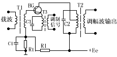 图1是晶体管基极调幅电路,载波信号经过高频变压器T1加到BG的基极上,低频调制信号通过一个电感线圈L与高频载波串联,C2为高频旁路电容器,C1为低频旁路电容器,R1与R2为偏置的分压器,由于晶体管的ic=f(ube)关系曲线的非线性作用,集电极电流ic含有各种谐波分量,通过集电极调谐回路把其中调幅波选取出来,基极调幅电路的优点是要求低频调制信号功率小,因而低频放大器比较简单。其缺点是工作于欠压状态,集电极效率较低,不能充分利用直流电源的能量。