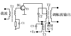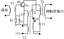 图2是发射极调幅电路,其原理与基极调幅类似,因为加到基极和发射极之间的电压为1伏左右,而集电极电源电压有十几伏至几十伏,调制电压对集电极电路的影响可忽略不计,因此射极调幅与基极调幅的工作原理和特性相似。