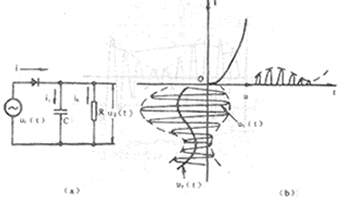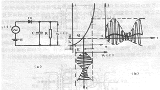 如图6(a)是大信号检波电路,由于输出电压交流部分与调制信号最大值成正比,故又称为直线性检波,其特点是:(1)输入电压幅度一般500毫伏以上;(2)没有偏置电压E,由于输出电压的反作用,实际上工作点处于u<0的区段[见图6(b)]。因此,大信号检波二极管,在载波一周期内,只有一段时间寻通,而另一段时间截止。大信号峰值二极管检波器的主要参数计算如下: