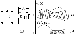 图7示出对角切割失真情况,产生该失真的原因是滤波时间常数RC选得过大,以致滤波电容的放电速率跟不上包络变化速率所造成的,要防止对角切割失真现象,时间常数RC应满足下式关系:RC<(/m)×(TΩ/2π)式中:m为调幅系数,TΩ=2π/Ω,若m=0.3时,则得RC<0.5TΩ