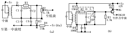 另一种切割失真是由于检波器的低频交流负载与直流负载电阻不同而引起的,通常检波被输出的低频电压经耦合电路[图7(a)中的R1C1]再送至低频放大器中去由于C1数值很大,(约为10微法)它的两端降有直流电压为载波幅度的平均值Uco若R1 m 式中:R为直流电阻,交流电阻R-=R//R1。不失真条件可写为m 图8(b)是电视接收机的滤波电路,由于调制信号为高达6兆赫的图象信号,为防止对角切割失真,电容C1只选10皮法,但只靠它滤除载波还不够,还要接入LC2滤波器,二极管串接小电阻200欧使信号增大,补偿二极管内阻的减小,从而使传输系数相对稳事实上,检波线性也得到改善。 图8 收音机和电视机的检波电路