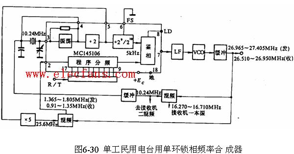 图6-30是一个用MC145106构成的单环锁相频率合成器,作为民用电台的发射机主振和接收机第一、第二本振。