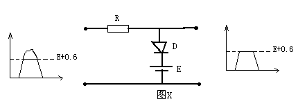 图X是一个限幅电路,在输入端没信号输入时由于二极管D反向连接,所以输出电压为零。当有脉冲信号输入时,如果这个脉冲的幅度足以电压源E时,D就导通,这样电路将输出脉冲的最大值限制在E+0.6上(0.6是D的正向导通压降),也即E+0.6是此限幅器的门限电压。