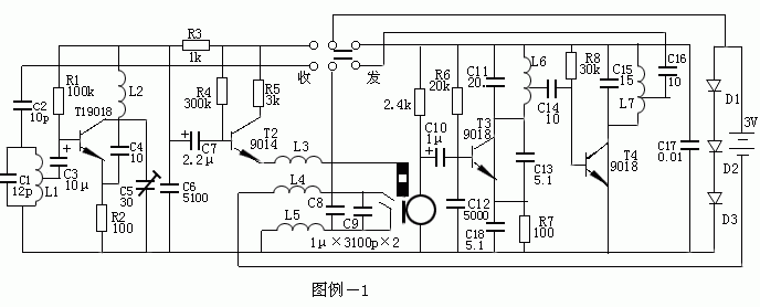 a) 发射部分:由T3、C13、C11、L6组成电容三点式和高频放大器(由T4、L7、C15组成),这部分电路同学们已经很熟悉不再赘述。 b) 同步接受部分是实现混频,本振,同步检波和低放四种功能。 L1、C1构成输入回路,调谐在接收信号频率上(本机为90MHz),而本振回 路L2、C5的谐振频率为接受频率的二分之一。接收信号与本振信号的二次谐波引进混频后输出的差频信号正好落在音频范围之内。音频信号的强弱约等于音频负载阻抗与R2阻抗之比。每当接收到信号时,其音频输出幅值可达数十毫伏,该幅值与接收信号的强弱无关。又由于T1的输出电导受其集电极电流控制因而T1不仅本身具有控制本振频率的功能,而且T1集电极电流中的二次谐波成分的大小在很大程度上影响到接收部分的工作特性。所以为提高二次谐波幅度,反馈电容C4的取值不小于基波振荡时的2~3倍。本振频率除受控于T1的工作特性外,很重要的一点在于它在一定范围内受控于输入信号频率。因为当本地振荡信号二次谐波频率接近于接收信号频率时,T1集电极电流中将有两者混频后输出的低频成分,使晶体管输出电导随之改变,于是本振频率也产生相应变化,从而被外来信号频率同步,这正是本机的同步接收过程。 图中作为本振和同步检波级,T1接成共基极电路作为混频,T1则接成共发射极电路。T2为发射极跟随器,与阻抗较低的耳机相匹配。