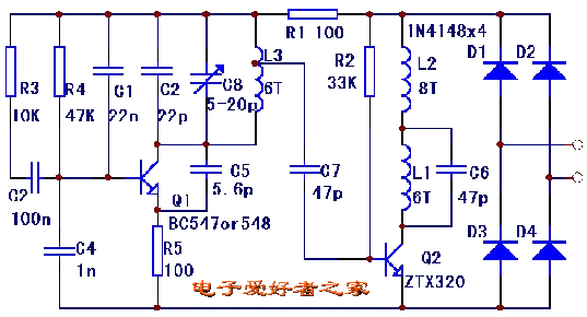 这是一个利用普通电话线在近距离无线发送语音信号的设备,可穿行接入电话线上。当摘下话筒,线路接通时就可用电话本身发送语音而不需要发射天线,也不需要电源(利用电话线作天线,利用电话信号作为电源)。发送信号在FM频带,可以利用FM接收机在电话线附近接听。发射频率可以调整。 此线路为工作于93MHz的射频(RF)振荡器。电路由一个全波整流桥提供电源。C1、C8、L3、T1组成FM振荡器。每个发射机(TX)需要一个振荡器产生射频载波。L1、C6、T2组成功放级。由电话线来的音频信号通过R3和C2耦合刀T1的基极以调制振荡器,这是通过改变晶体管结电容来实现的。结电容是作用于晶体管基极电压的函数。 这类电路通常需要校准。L1、C6放大电路的谐振频率需要调整得与C1、C8、L3的谐振频率相匹配。实际上本电路可以不作任何校准就能工作。 当C1为27p时,此线路发射频带为86~95MHz。使用22p的电容频带为90~95MHz(与线圈间距有关)。如果希望使用100MHz以上的频带,C1要换为10~15p的电容。