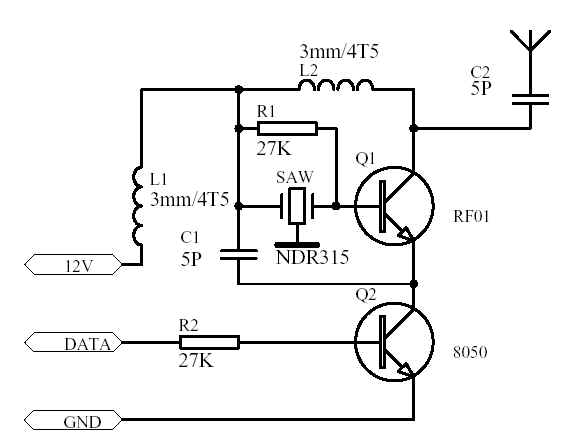 ?使用声表谐振器的无线发射电路形式很多,这里推出又一款电路,这个电路是我在3年前参考电子报上的文章后,又结合了该文章介绍的那个模块的实样做的,在经过批量生产后,改进了一些参数,现在这款产品真是非常不错。不过现在这个东东的仿制产品实在太多了,质量差别也很大,但是因为它比较简单,所以我觉得还是很有必要把它弄出来给大家,我在网上也找到许多类似的电路图,不过其中有的是有陷阱的哦,希望大家要注意学会自己辨别一些BUG。对于这个模块,我没有测试过它的无线发射的绝对功率,不过我们开着汽车在公路上拉过距离,它和普通的315M超再生接收模块相配合,可以达到800米距离,虽然我的电路只要减小一下8050基极电阻的值,通讯距离会加大到1200米甚至更加远,但是经过大量的实验证明,那样不是很可靠的,原因我不是很清楚,可能有2方面的原因,一个是8050在R2小的时候,有轻微的导通,导致发射不能快速截止。还有一个是R2很小,8050开通电流比较大,对供电可能是一个扰动,而达不到起振要求。我曾经怀疑过自己的电路是不是很匹配,因此特意买了好多号称1500米的类似模块,发现它们也有一样的不可靠性,普遍表现为偶尔的不能起振或者波特率上不到2K,后来我就增加R2电阻,在大于15K时,发射一直很正常,距离和27K的差不多,所以现在就用这个电阻了,这里的L1L2,我是用0.8mm的免去漆漆包线在3毫米的钻头上绕4圈半脱胎而成 ? |