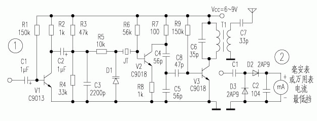 该电路用了调谐变压器,因而在制作完后要调整其磁心,使之匹配。其方法是制作一个简易场强电路(如图2所示),接至变压器的输出端,调整磁心,直到电流表指示值最大为止。电路中所用元器件尽量使用高频特性好的元器件。晶振选用标称值为29~36MHz之间的晶振,D1可用MV2105,变压器需自制,可选用电视中周作骨架,去掉屏蔽罩,用∮0.2mm左右的漆包线在骨架上初级绕3匝,次级绕1匝。天线可用1/4波长的软导线代用。