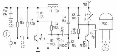 需要说明的是射频发射专用管T2,其型号是FF501,采用标准的T0-92封装(像9000系列三极管一样),外形及引脚排列如图2所示,其ICM为45mA,fT大于1.3GHz,VCEO为13V。专用管的优点就是一致性好,射频输出功率较大,电路容易调整,FF501完全可工作在更高的频段,读者可尝试将发射管用于其它电路的高频发射实验。电路中的L2用∮1.0mm的漆包线在∮5.1mm的钻头上绕5匝脱胎拉长至0.8cm,C3~C8可用高频瓷介电容,天线最好用1.2米的拉杆,并垂直放立。天线一定要架好后再上电。电路的工作电流约25±5mA。如发射频率不在88~108MHz范围内,可适当调整谐振线圈L2的长度。