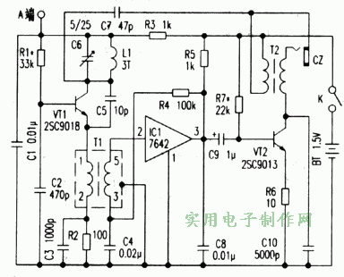 因此,这里采用从VT1的发射极通过串联回路中的高频扼流圈上感应到的调幅信号再进行高频放大、检波输出音频信号的方法,以克服上述不足。当VT1工作时,在高频扼流圈上会形成一个被调频节目调制的调幅信号。这个信号通过互感器T1耦合到调幅专用接收微型IC1 7642上进行调幅波的解调。