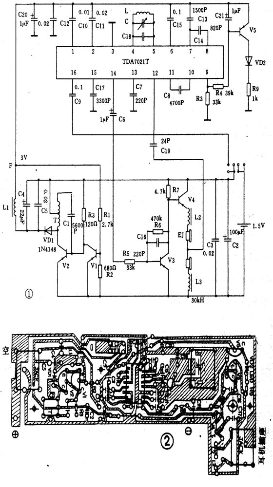 如图l所示,FM信号经C19至IC(12)脚,经内部高频放大后与④⑤脚FM本振信号在内部进行混频、中放、鉴频,从(14)脚经C6、R5至V3、V4等元件组成的低频放大电路至耳机输出。Vl、V2、T等元件组成升压电路,正常时F点3V左右。V5、R9、LED组成调谐指示电路。
