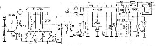 ICl是FM专用高频头电路TA7335,内部包括高放、本振、混频等功能,工作电压为2~6V,引 脚①是信号输入端;②是电源的正端;③和④是高放电路;⑤接地;⑥为中频输出端;⑦是本振回路;⑧接AFC电压。IC2是调频接收机专用的中频放大电路MC3361,只需在其外接少量的元件,就可以完成二次变频、中放、鉴频、音频放大等功能。从ICl的⑥脚输出的第一中频信号进入MC3361的16脚,与X3(10.245MHz)信号再次混频,差出455kHz第二中频信号由X3耦合,因而实现了二次变频,电路的电感均可自制。如果购不到带薄通滤波器BPB804,可用附图2(b)电路代替,