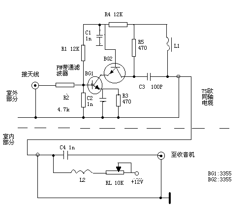 输入端用75欧的高频同轴电缆接天线,信号先经FM带通滤波器滤波,去除FM以外的其他杂散信号,以提高信噪比,减少交调干扰,此滤波器在自制时千万不能省去,然后信号输入由BG1,BG2组成的放大电路,此设计只用了一级放大,以免增益信号过高反而使交调变得更厉害,强台影响弱台,选择性变差,再一个是易自激,增加调试难度,同时这一级放大采用了共射共基电路,故增益高,频带宽,工作稳定,便于业余条件下制作,且本放大电路经作者精心设计成免调试方式,大大提高了制作成功率,最后信号由同轴电缆输出到室内,由于放大电路装在室外天线上,而电源置于室内故在电路设计中设置了由L1,L2,C3,C4构成的频率隔离电路,以使高频电缆在传输信号的同时,又将直流电源送至放大器,并且通过调节电位器R(L)的值可改变放大器的增益。作者用分支器的外壳作屏蔽,效果相当好。具体电路图如下: