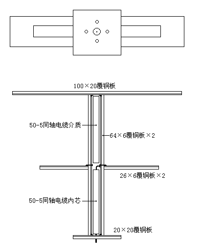 上左图为常用的由两根金属条或金属管构成的半波振子天线,这种天线不象折合振子天线那样有零电位点可共固定之用,用上右图所示的方法就能很好地解决问题。虚线内的结构可看作下端短路的1/4波长传输线,上端阻抗呈无限大,正好可用来作为固定半波振子支撑结构。
