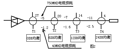 上面例子说明在40MHz的回传频率上,对不同端口的回传路径损耗差别可达17.7dB,这么大的差别就要求前端接收机有很大的输入范围(很大的动态范围)但是系统有载噪比的限制,所以当回传信号电平较少时是不允许的,如上面的例子,第一个分支器回传的电平设为60dB,那么第四个分支回传的信号电平就只有42dB,显然由第四个分支回传的信号时,载噪比是不符合指标的,一般我们要求用户端的终端设备如机顶盒或CABLE MODEM所发送的回传信号到达前端时都必须相近,那么如何做到这一点呢?即如何将各个分支器端口的损耗归一化呢?有一种简单而实用的方法就是采用均衡器。因为均衡器是设计成覆盖整个正向和反向频带(5-750MHZ)的,这样均衡器可修正回传通道的损耗差别同时也平坦正向通道的响应。例如一个6dB的均衡器将在5MHZ处衰减6dB,而在40MHZ处将衰减4.6dB,,在750MHZ处衰减0dB,这个均衡器插损为1dB,这样在750MHZ处损耗为1dB,在40MHZ处为5.6dB,再以前面的例子分析,在各分支器的端口处插入均衡器:如图二所示,回传40MHZ处各分支器端口到放大器的衰减值如表二: