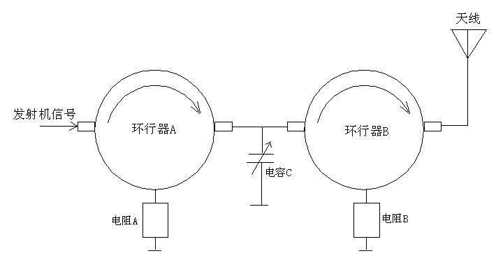 在这里我向大家介绍一款利用环行器的单向传输特性做成的无源无级功率调节器。在高频功率放大电路中,普遍都是利用PIN二极管的电抗特性来完成输出功率的调整,这种功率调整电路有其不足之处,当功放管偏置调定以后,一般都有某个最佳的激励电平与之对应,使其输出达到最佳状态,激励过小,影响信噪比;激励过大则会造成非线性失真。采用环行器所做成的无源功率调节器将不存在此问题,它由两个环行器串接而成,并在其串接线与地之间加入一个可调电容器,如图所示。这个无源功率调节器加插于发射机与发射天线之间,单环行器A起着输出功率调节的作用,环行器B起着隔离保护的作用,调节电容C,使电路发生失配,输出功率的一部分将变成反射功率被电阻A所吸收,C的容量大小,影响着反射的大小,所以通过调节电容C就达到了控制输出功率大小的目的。思维稿