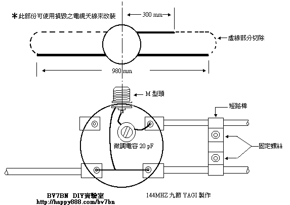 ..........首先将主 尺寸标示清楚, 再进行裁锯及钻洞. 在钻洞时需小心, 中心孔必须与主 垂直, 依图施工完成後, 最重要的就是调整校正了. 在调整时, 天线高度最好离地两米以上, 并且远离金属与建 物, 先以陷波表与天线交联, 微调电容大约在 20 pF 的位置, 调整短路棒 使天线谐振在两米波段内, 然後取下陷波表 接上电缆线, 驻波比表, 及发射机, 开始调整 电容及短路棒位置, 以取得最低之驻波比. 此天线长度约两公尺, 请小心安装 避免在高压线旁施工. 此天线增益约有 15dB, 效果令人满意, 最後祝您实验成功