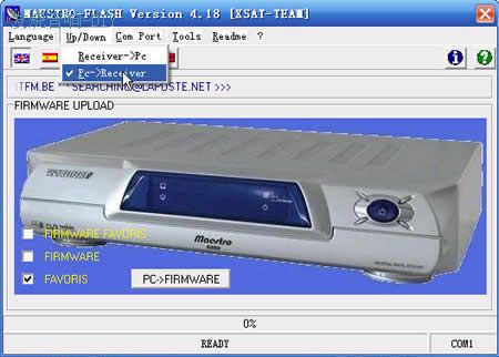 按图选择Pc>Receiver,下面选择FIRMWIRE FAVORIS(表示系统文件和节目表文件,缺省为只选FAVORIS,一定要改)