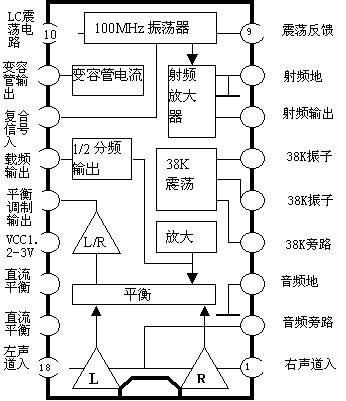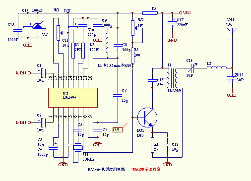![]() | 本文向大家介绍一种以BA1404为核心的小型立体声调频发射机,因为好多朋友对他非常热衷,向我问及它的资料,所以就把它放了上来。其实关于BA1404应用在许多电子杂志和报刊上多有介绍,算不上什么新鲜,但他确实很实用。 BA1404是美国ROHM公司生产的调频无线电发射专用集成电路;其集成度高;需要的外围元件少;工作可靠;电源电压适应范围宽,低至1.5V时仍能正常工作,很适合业余条件下制作各种无线电发射装置。由于我没有扫描仪,所以只能在PROTEL中画了一个典型电路在WORD中画了它的内部功能框图和引脚说明图给大家介绍,据说这个电路配合较高灵敏度的调频收音机距离能达到1000米,你可以去试制,如图一。内部结构和引脚图如图二。特别指出的是38KHz的晶振交难找到,可用一57P的电容结余电路的5、6脚之间可代替工作,只是立体效果不是太明显罢了! 用他你就可以制作一台自己的小型立体声广播电台了!需要注意的是原图中功率放大级所用三极管为 2SC8050其实大家都知道2SC8050的最高频率为100MHz左右,在这里使用是很不恰当的,会因过大的功率损耗而急剧发烧而在短时间烧毁,倒不如用国产的3DG130C或3DG12C等国产的中功率管加以散热帽效果来的好,如用***产的D40、D50等发射专用管的话效果会更好,只是工作点需要从新调整。注:由于本人疏忽功放级没有连上电源,应将T1上部连接至+4.5-6V电源端在上次电路图的基础上增加了输出滤波电路,使电路更加完善,频率性能更好。 |