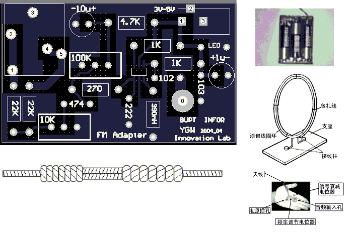 此外,该发射机还有很多的用途。例如从PC机、电视机、CD、DVD等音频输出设备输出的音频信号,经该机调制后发射,使用普通的FM收音机即可接收,且音质良好,等价于无线耳机。最为重要的就是,该电路的成本极其低廉,实现极其方便。这样,你就轻松地实现了音频信号的发射与接收。配戴一副普通的FM收音机,就可以随心所欲的在房间周围或后院走动,同时享受着客厅里电视播放的体育新闻!