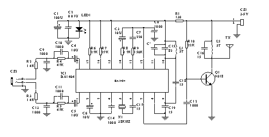 由电脑等输出的立体声音频信号由CZ2插座输入,两路音频信号经过C10、C11、R4、R5等组成预加重网络后,经过C4、C5耦合到IC1的第1、18脚,X1 38KHZ晶振与内部电路组成信号发生器,该振荡信号一路经过分频器产生19KHZ导频信号,另一路用于对立体声音频信号进行编码,编码信号由第14脚输出,与第13脚输出的导频信号一起构成立体声复合信号,并送入第12脚对高频振荡信号进行调制,调制后的射频信号经内部放大后由第7脚输出,Q1及外围元件组成的射频功率放大对调频信号做进一步的放大,最后由TX天线向空中发射。红色LED1既做为工作指示灯,又同时做为IC1的稳压管,为IC1提供约1.9V左右的稳压直流电。虽然该机工作电压比较低,但能满足几十米到百米范围的收听需要,如果配合高灵敏度的调频收音机,传送距离还可以增大。如需更大的发射功率则需接更大功率的放大器。