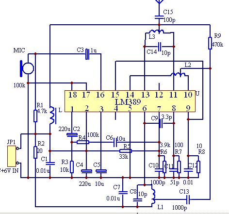 | LM389是其中包含有一个音响功放电路和三个频率高达120M以上的晶体管,它的内部电路及引脚如下图:  下图为用美国国半的集成电路制作的一款远程无线发射电路,不难看出,实际上就是利用它的音响放大部分作为话筒的音频放大,然后利用1脚输出的音频信号来调制后级的高频振荡部分,高频振荡就利用它内部的高频三极管来完成。它配合良好的调频收音机可以发射1KM的距离,电路中的电感用直径0.50mm的漆包线绕成直径6mm的空心线圈,其中心抽头.具体是L1,L3均为6匝,中心抽头. L2为3匝,中心抽头.其性能要比晶体管制作的电路较稳定.以下是实际制作的图片和电路原理图.爱好者可以自已动手制作.