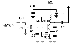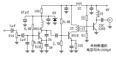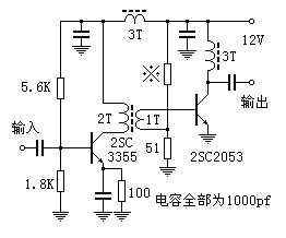 | 目前,适合自己动手制作的发射实验当数无线话筒等调频器材,虽然各种报刊上这类文章较多,但是报刊缺乏交互式手段,爱好者制作过程中遇到问题很不方便与作者、其他读者进行交流。再者,报刊编辑部选登的制作文章不一定都能经过验证,因此,有些作者构想出来的制作给初学者带来困难。 这是一个比较简单的实用型制作,本文打算从简到繁一步步深入,你若是愿意同步动手实验,不久你将能够制作适合正式场合使用的调频发射机。当然,实验还是从最简单的做起,下图是一个最简单的振荡器,它是调频发射的基础。 图中的线圈用1.0mm的漆包线在3.2mm的钻头上绕6-8圈,可覆盖88-108MHz,7圈时在100MHz附近。按上图连接好,其实就已经是一个简单的发射机了,通电即可发射,不过发射的是未经调制的等幅信号,附近的调频收音机接收到信号只会出现静音。像下图那样加上调制信号,就可进入实用状态了。  这时,假如你将随身听,影碟机等输出的音源信号连接上图发射机的音频输入端,在附近就可以用收音机来收听了。上图虽能发射,却不实用,其一是发射能量很小,只能在室内使用,在室外开阔地也不过几十米。其二是频率不稳,由于天线只是一段导线,通过100P电容与振荡回路相连,因此天线周围的环境均会影响发射频率。若想使其达到能用的程度,应在其后再加两极放大,见下图。  这是应网友的要求搭出的一个功放电路,输出功率令人满意,但是也存在很多问题,将在下文详述。振荡器与功放连在一起,就成了一个完整的调频发射机,见下图。 图中的发射机很容易制作成功,这里所说的成功是插上天线接通电源即可进入工作状态,若是希望发射机进入最佳工作状态还需要做一些调试。其实,爱好者做实验最大的乐趣就是通过自己动手调试使作品更趋完善,获得最佳性能。 首先,这种输出电路工作于非甲类状态,对负载阻抗有更严格的要求,通常发射机多为50Ω输出,爱好者实验不一定容易找50Ω的射频电缆,而75Ω的射频电缆到处都能买到,况且75Ω的天线也容易制作,故此机采用75Ω输出,通电之前应在输出端接一个75Ω的电阻,调试完成以后再接75Ω的天线。本机最大输出1W以上,不要用那种1/8W的小电阻,接上就烧。烧个电阻倒没什么,可是电阻一烧放大器便相当于空载,管子就危险了。 通电以后所需要调试的最主要内容是发射管的工作点,工作点不同输出的谐波成分大大不同。本机振荡级选择的晶体管工作点使其具有较大动态,实测二次谐波比基波低二十多分贝,三次四次更低,完全可以忽略不计。推动级工作于接近甲类的甲乙类状态,也不会产生大能量的谐波。关键在输出级。输出级工作点的选择比较麻烦,上偏置电阻与下偏置51Ω电阻形成的分压应低于发射管的发射结电压,使其工作于乙类和丙类状态之间。选用1KΩ时接近乙类状态,此时发射管工作电流260mA,输出功率700mW,二次谐波比主波低10dB左右,三次四次更低,输出的主频能量在500mW以上。 随着上偏置电阻的加大,发射管的工作状态将靠近丙类,功率计的指示倒是逐渐增大,最大时高达1300mW,但此时的各此谐波也逐渐加强,主波功率反而降低。在专业制造时,这一矛盾并不难解决,不过这一电路是为初学者制作设计的简单型,只好放弃电源效率指标,建议上偏置电阻使用1KΩ。实验中2SC2053严重发热,虽然实验过程中并未损坏,估计长期使用肯定不行,建议制作时换用2SC1970或用两个2SC2053并联使用。并联时要注意采取均流措施。假如你只是希望品尝一下动手制作的乐趣,并不一定需要这么大的输出功率,也不需要发射多远,这时可将电路参数作些改动,电路结构不变,用6V电源,输出功率也在100mW以上,见下图。  与上图的电路结构完全相同,只是改了几个元件的数值,晶体管也做了调整。由于输出功率较小,用3355做输出也不用考虑输出管的安全问题,可以长期稳定地工作。 |