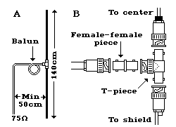 | 最常用的天线是中心驱动的半波偶极子天线, 如图右A所示。制作办法是:将一条粗铜线(或铜管、铝管,或用同轴电缆的屏蔽层)焊到BNC插座上。粗铜线的长度大约是1/4波长,即 75/f 米, 其中f是发射频率(兆赫)。如果你不肯定你使用的频率, 就用 70cm。这样的部件需要两套,B图显示怎么样把这两套部件连在一起。在上面的部件粗铜线应该只与BNC插座的中心连接, 而在下面的部件粗铜线应该连接到BNC外壳。 偶极子天线的原阻抗是75欧姆。由于偶极子的两半是对称的(即平衡的),和同轴电缆(不平衡的)连接时需要有一个“1:1 平衡-不平衡变压器(balun)” 。这个变换器最简单的制作办法是把电缆绕直径大约10-20cm的4-5个圈。 天线应该垂直放置, 在电缆和天线之间应该留出至少50cm空当。 | ![]() |
