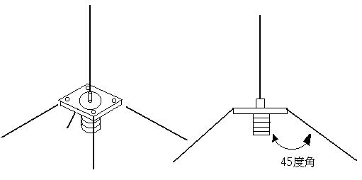 所以我们得到0.5公尺也就是50 公分 的长度 再来就要准备材料 我们准备5只50公分的铜条 和一个M型座的接头(如图1) 然後用烙铁把M型的主轴与其中一只的铜条焊接起来 再把其他四支用螺丝锁在四边 或是焊上 再把四只各向下45度(如图2)