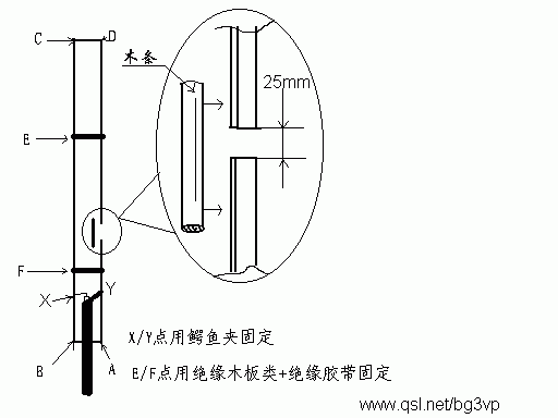 7.带鳄鱼夹的50欧线夹在图中的馈电点X/Y,把天线整体用绝缘胶带固定在一根木棒上,立在较空旷处,就可以测驻波了,调整鳄鱼夹在天线上的部位,使得驻波最小.没有驻波表的朋友,可以用接收信号的方法,接收145MHZ附近信号,看接收机的S点,直到接收的S点最多.