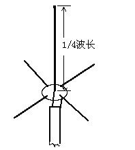 图为天线的结构图,这是一种平面接地天线,此天线由一根垂直受激励的1/4波长振子组成,振子与一个人工地面有关系,人工地面由四根水平放置的,而且在电气上是接地的辐射棒组成,辐射棒与地面的夹角不同,天线所呈现的阻抗也不相同,与地平面为45度时,阻抗为50欧。垂直的那一根接电缆芯线,下面的四根接电缆的屏蔽层,并且连在一起。