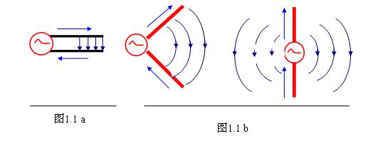 导线上有交变电流流动时,就可以发生电磁波的辐射,辐射的能力与导线的长度和形状有关。如 图1.1 a 所示,若两导线的距离很近,电场被束缚在两导线之间,因而辐射很微弱;将两导线张开,如 图1.1 b 所示,电场就散播在周围空间,因而辐射增强。