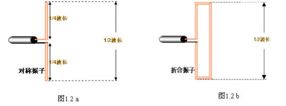 两臂长度相等的振子叫做对称振子。每臂长度为四分之一波长、全长为二分之一波长的振子,称半波对称振子, 见 图1.2 a 。