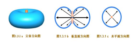 发射天线的基本功能之一是把从馈线取得的能量向周围空间辐射出去,基本功能之二是把大部分能量朝所需的方向辐射。 垂直放置的半波对称振子具有平放的 “面包圈” 形的立体方向图(图1.3.1 a)。 立体方向图虽然立体感强,但绘制困难, 图1.3.1 b 与图1.3.1 c 给出了它的两个主平面方向图,平面方向图描述天线在某指定平面上的方向性。从图1.3.1 b 可以看出,在振子的轴线方向上辐射为零,最大辐射方向在水平面上;而从图1.3.1 c 可以看出,在水平面上各个方向上的辐射一样大。