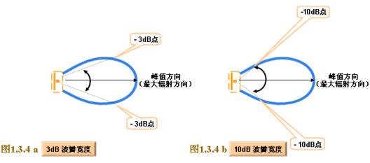 还有一种波瓣宽度,即 10dB波瓣宽度,顾名思义它是方向图中辐射强度降低 10dB (功率密度降至十分之一) 的两个点间的夹角,见图1.3.4 b .