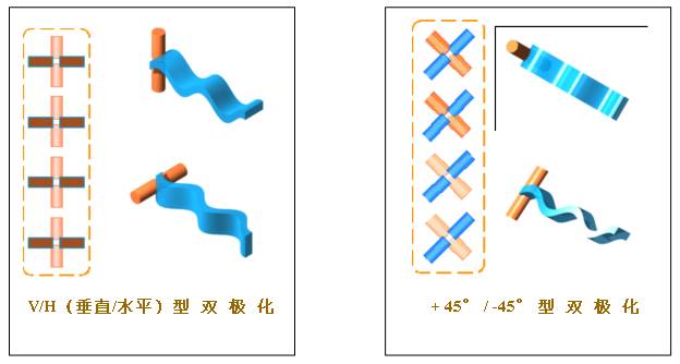 下图示出了另两种单极化的情况:+45° 极化 与 -45° 极化,它们仅仅在特殊场合下使用。这样,共有四种单极化了,见下图。 把垂直极化和水平极化两种极化的天线组合在一起,或者, 把 +45° 极化和 -45° 极化两种极化的天线组合在一起,就构成了一种新的天线---双极化天线