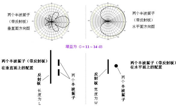 前面已指出,四个半波振子排成一个垂直放置的直线阵的增益约为 8 dB;一侧加有一个反射板的四元式直线阵,即常规板状天线,其增益约为 14 ~ 17 dB 。