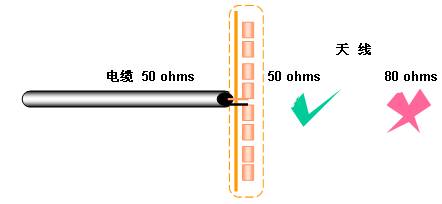 什么叫匹配?简单地说,馈线终端所接负载阻抗ZL 等于馈线特性阻抗Z0 时,称为馈线终端是匹配连接的。匹配时,馈线上只存在传向终端负载的入射波,而没有由终端负载产生的反射波,因此,当天线作为终端负载时,匹配能保证天线取得全部信号功率。如下图所示,当天线阻抗为 50 欧时,与50 欧的电缆是匹配的,而当天线阻抗为 80 欧时,与50 欧的电缆是不匹配的。