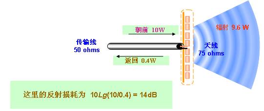 例如,在右图中,由于天线与馈线的阻抗不同,一个为75 ohms,一个为50 ohms ,阻抗不匹配,其结果是