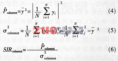 首先分析SIR估计的两种方法,相干估计和非相干估计的原理。对于相干估计,由于导频信号已知,假设导频序列数值固定为1,则接收信号y(i)近似为一个高斯平稳随机过程,可以用其时间平均代替集平均。假设接收信号y(i)的N个采样点为{y1,y2,y3,…,yn},则接收信号功率、哭声功率和信干比估计值可分别表示如下: