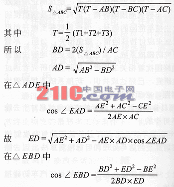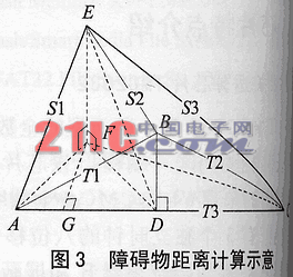 已知由S1、S2、S3、T1、T2、T3所组成的立体障碍物距离计算示意如图3所示。其中A、B、C三点分别代表安装在车头前的三个超声传感器,E点代表障碍物;则EF表示由E点到水平面的距离,FG代表障碍物到车头的距离,AG表示障碍物到车一侧的距离。我们要求的就是EF、FG及AG三个直线。解法如下: