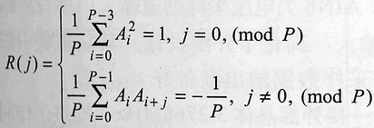 随机过程是白噪声,其瞬时值服从高斯分布(正态分布)。它的功率谱密度在很宽的频带内是均匀的,而且自相关函数具有δ函数的形状。伪随机码虽然仅有2个电平,但却具有类似白噪声的相关特性,只是其幅度概率分布不再服从高斯分布。所以,可以用伪随机序列的平衡特性、游程特性和相关特性等来描述伪随机码。伪随机编码是用逻辑运算实现的,信号的自相关函数满足: