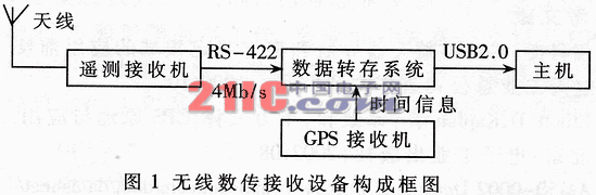 无线数传接收设备是某靶场测量系统的一个重要组成部分。如图1所示,该设备由遥测接收机利用天线接收经过调制的无线电波信号,解调后形成传输速率为4Mb/s的RS-422电平差分串行数据流。以帧同步字打头的有效数据帧周期性地出现在这些串行数据中。数据转存系统从中提取出有效的数据帧,并在帧同步字后插入利用GPS接收机生成的本地时间信息,用于记录该帧数据被接收到的时间,然后送给主机硬件保存。