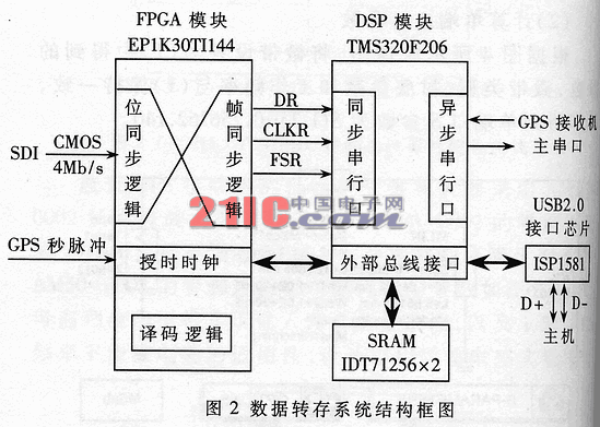 数据转存系统主要由FPGA模块、DSP模块、USB2.0接口芯片构成,各个模块之间的相互关系如图2所示示。图中,4Mb/s的串行数据输入信号SDI已由RS-422差分电平转换为CMOS电平。为突出重点,不太重要的信号连线未在图中绘出。下面分别介绍这几个模块的主要功能。