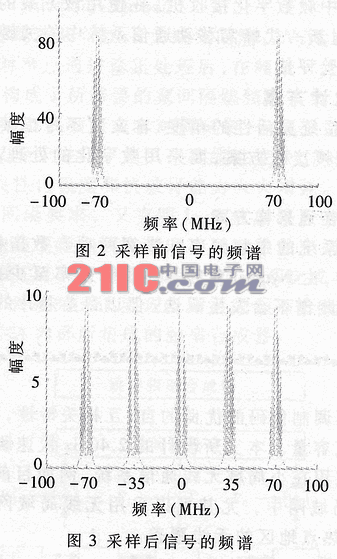 例如,当发送端的基带信号是实信号时,选择接收机的采样速率fs=35Msps,频谱周期性复制到:f1±kfs(k为整数),采样前后信号频谱的变化如图2、图3所示。