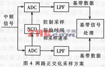 笔者又提出了适用于发送端是复基带信号的两路正交化采样方案:借鉴正交采样的基本思想,使用两路ADCs以起始采样时间相距1/4个中频信号周期、同样的采样速率对中频信号进行带通采样。由于相位是以2π为周期的,所以这种方法得到的两路采样信号相位相差π/2,可以把它们分别看作一个复数信号的I、Q两路,对于每一路数据都按照前一种方案的思路将频谱搬移到基带。此方案示意图如图4所示,其中NCO(Numberically Controlled Oscillator)表示数控振荡器。