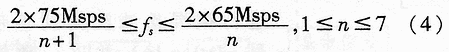 在式(4)给出的采样速率集合中,n=1时,75Msps≤fs≤130Msps;n=2时,50Msps≤fs≤65Msps。选取一个最佳采样速率,使采样后频谱间距最大,从而降低对抗混迭滤波器带外抑制的要求。
